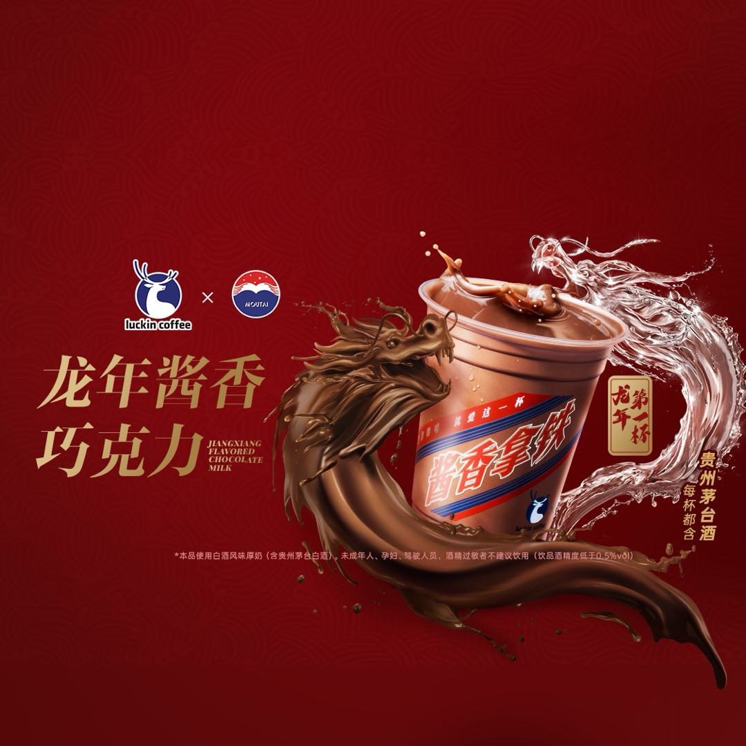 Now, Moutai has teamed up with Luckin again, this time launching a coffee-less chocolate drink that tastes “just like baijiu-filled chocolate”. The collaboration has been created to coincide with the run-up to Lunar New Year, with campaigns featuring Year of the Dragon imagery and slogans like “The First Cup of the Year of the Dragon”.