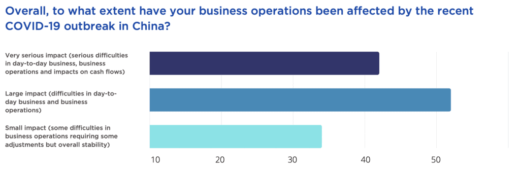 The overwhelming sentiment expressed by respondents was that the impact of recent outbreaks of Covid-19 on British businesses in China has been severe: 74% of businesses reported a “very serious” or “large” impact on day-to-day business, business operations and cash flows. Almost no companies reported “no impact” or a “positive impact”.