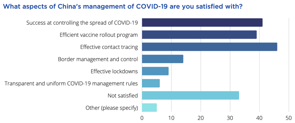 Given the success that China has had in managing Covid-19 in the two years following the initial outbreak, it is not surprising that many surveyed companies commended China on its effective contact tracing measures (46%), success at controlling the spread of Covid-19 (41%), and the efficient rollout of the vaccine programme (39%).