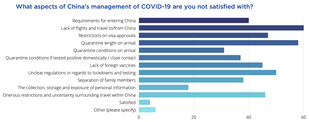 However, 33% of respondents indicated they were not satisfied with the management of Covid-19. Comments from respondents also report a sense of exhaustion with travel restrictions, exasperation with the scale of disruptions, and concerns over the continued shrinkage of the foreign talent pool within China.