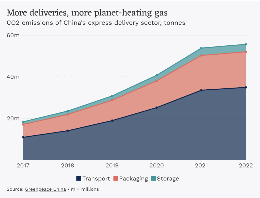 A Greenpeace East Asia report released this year noted that carbon emissions from China’s express delivery industry have grown by more than 200% over the past five years, reaching 55.6 million tonnes in 2022, with 62.7% of the total coming from transportation. Within transportation, 99.9% of emissions resulted from deliveries between cities and provinces.
