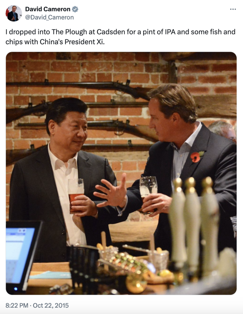 The visit of David Cameron and Xi Jinping to the Plough Inn at Cadsden, Buckinghamshire in 2015 has come to be seen as the defining moment of the ‘Golden Era’ of UK-China relations. The scene suggests a sense of normality; two men arrive in a pub, and one of them – ostensibly the local – orders them both a drink. They wear dark suits, and their ties are both off as if they are colleagues having just finished work. They sit side-by-side at the bar, exchanging observations about (you imagine) the world at large.