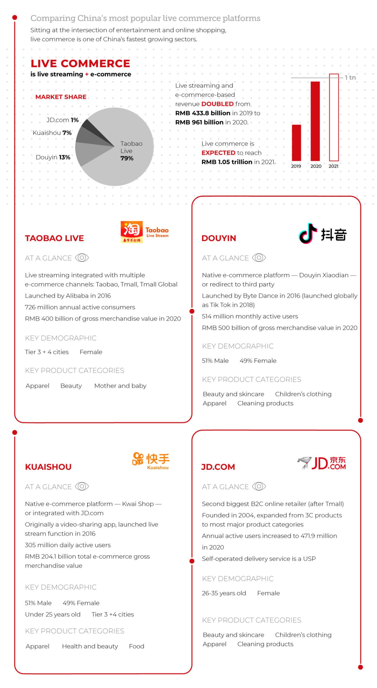 Bringing together the worlds of entertainment and online shopping, live commerce platforms including Kuaishou and Douyin are booming in China, stimulated by the shift away from brick and mortar retail during the Covid-19 pandemic. Here’s a round up of the key players.