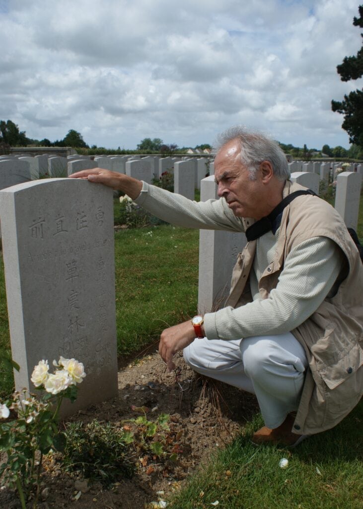 Author Clive Harvey beside a grave in a cemetary for Chinese workers in Noyelles-sur-Mer in northern France