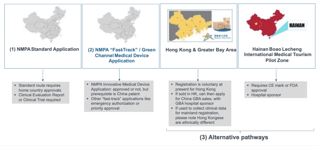 - Alternative pathways via sales to special areas within Greater China – the Greater Bay Area or Hainan Island Pilot Zone – that may enable easier registration via subsequent standard or fast-track approval processes.