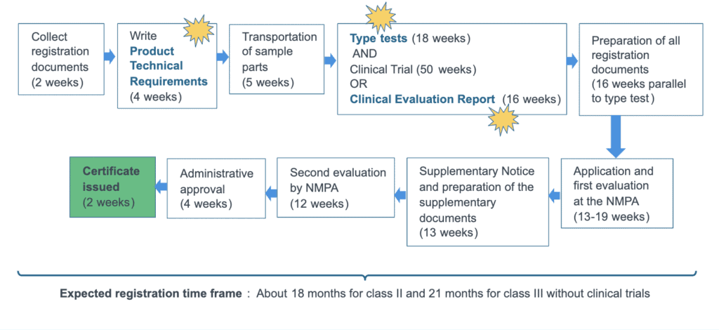 For class II and III medical devices, the registration process is longer and more rigorous. First, there is the documentation stage, including drafting of the product technical requirements (PTR), which is a key technical protocol outlining the local testing specifications and relevant China standards. Then follows local testing of product samples in China – a mandatory requirement – following by clinical evaluation drafting or clinical trials, before submission of the dossier to NMPA for review and approval.
