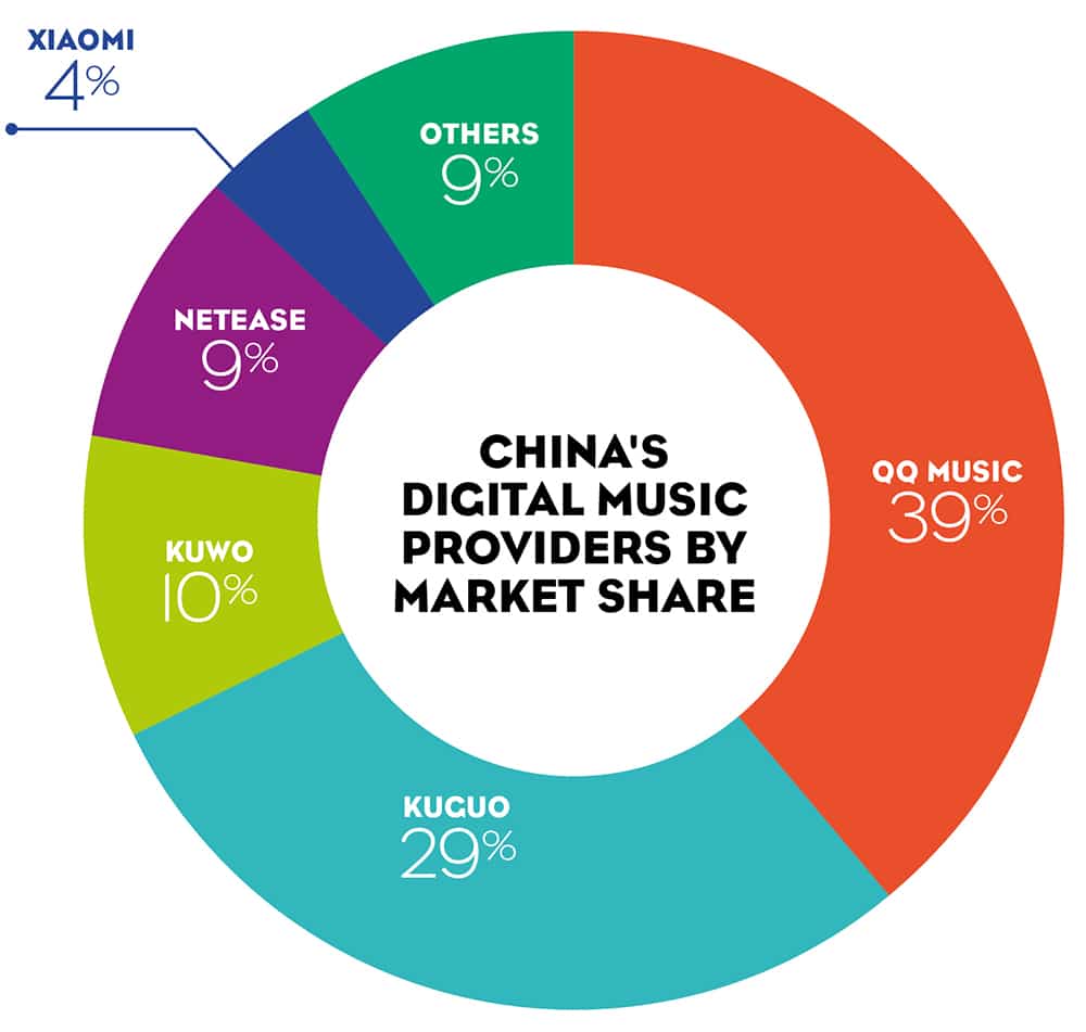 Tencent Music Entertainment Group’s (TME) platforms, is China’s biggest provider of music streaming services. TME owns the top three streaming platforms in China: QQ Music, Kuguo, and Kuwo, and in 2016 held a 78 percent share of the digital music market. And that market is not small. China’s digital music market was worth RMB 52.9 billion (£6.2 billion) in 2016, a growth of 6.2 percent over 2015. And as the world’s 10th largest market for recorded music it still has plenty of scope for growth.