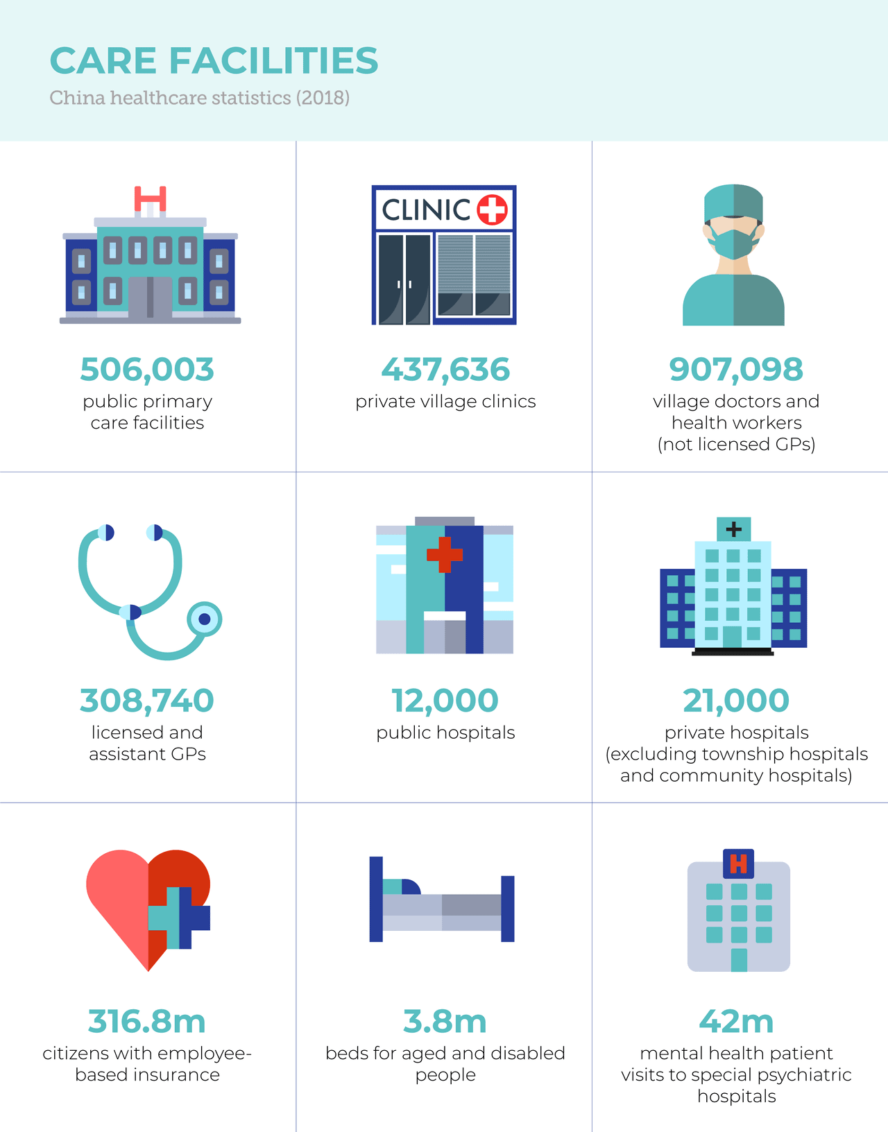 In 2018, there were just 506,003 public primary care facilities and 437,636 private village clinics across China. Village doctors, who are not licensed GPs, can work only in village clinics. In 2018, there were 907,098 village doctors and health workers. Village clinics in rural areas receive technical support from township hospitals.