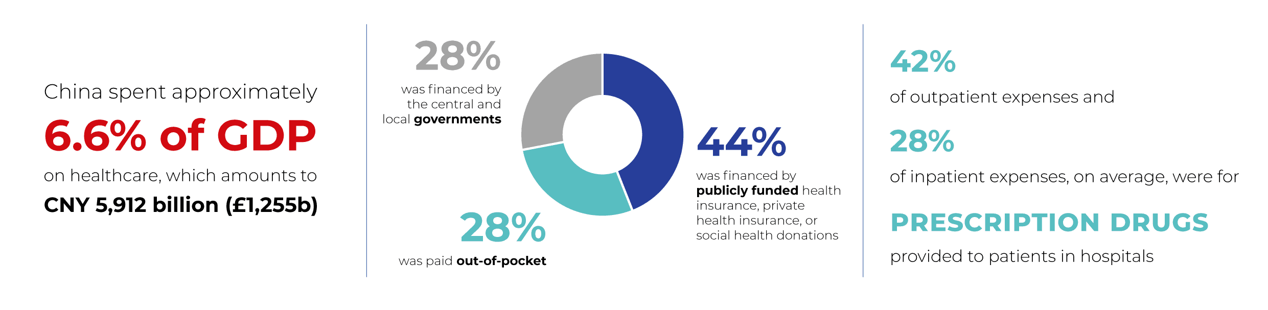 There are no annual caps on out-of-pocket spending. In 2018, out-of-pocket spending per capita was RMB 1,186 (£132) – representing about 28% of total health expenditures. A fairly high percentage of out-of-pocket spending goes on prescription drugs.