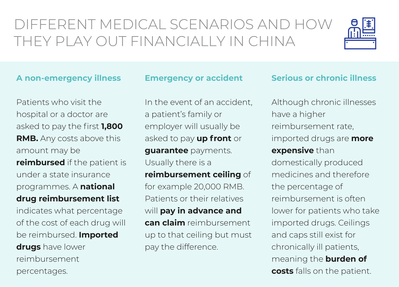 • Prescription drug co-payments vary: in 2018 in Beijing, this was between 50% and 80% of the cost of the drug, depending on the hospital type.