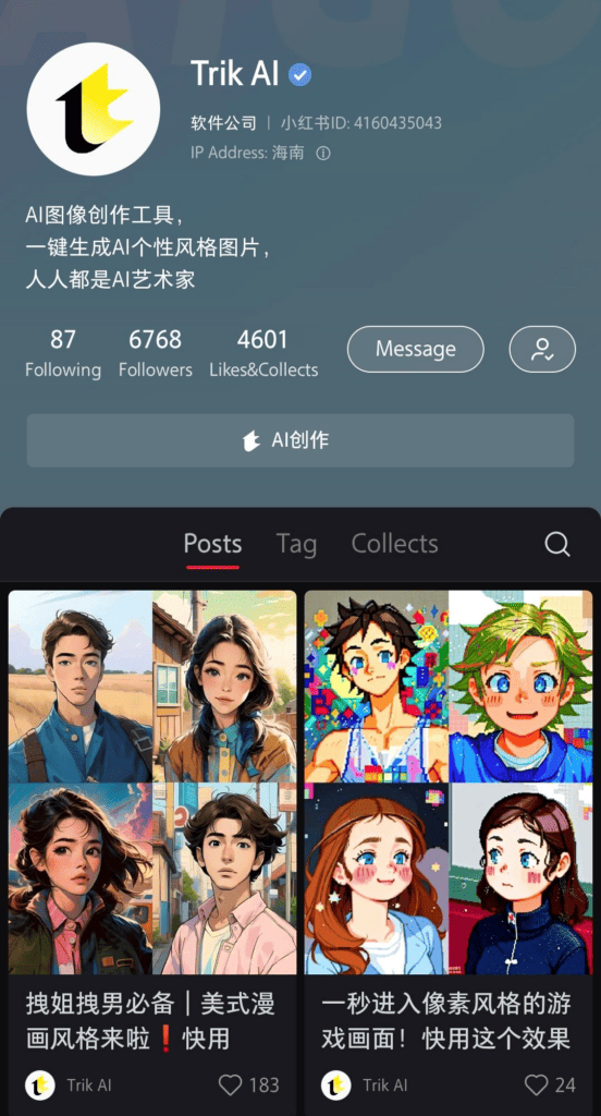 Like QQ, Xiaohongshu has recently embraced AI-based painting technology. The platform introduced an AI-assisted content creation tool known as Trik AI in early April, which is currently followed by around 6,800 fans.