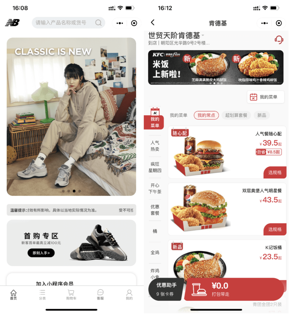 WeChat mini-programs for New Balance and KFC