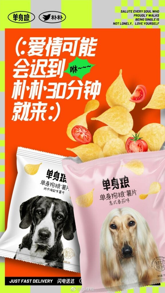 Other brands have attempted to build Single Culture into their brand positioning, including the snack maker Dan Shen Liang, which literally translates to Singles’ Food. With pictures of dogs imprinted on its packaging, the brand smartly capitalises on popular Internet slang such as “single dogs” (a humorous term used to refer to singles in China) and “dog food” (a term used by singles to describe public displays of affection) while also allowing it to tap into the growing number of pet owners in China, many of whom have turned to animal friends as a cure for loneliness.