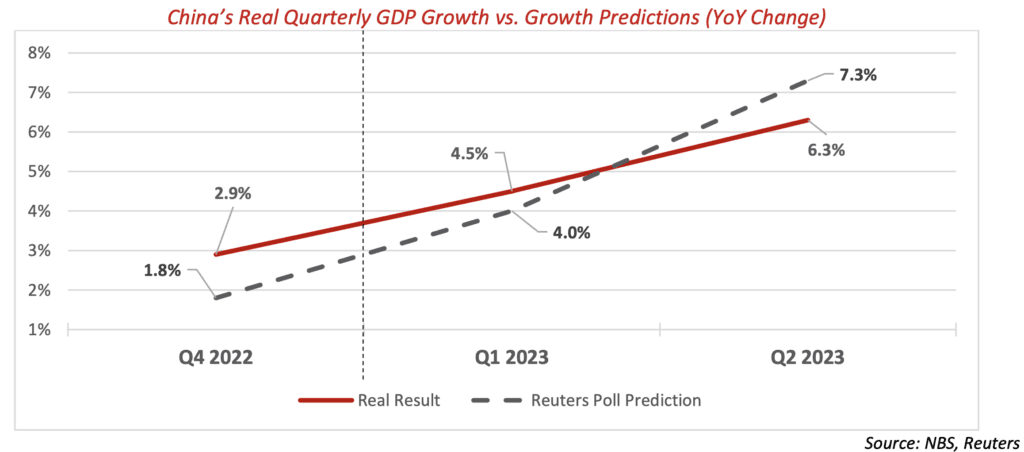 China’s disappointing GDP growth so far has been blamed on many factors: poor domestic and international demand, a property market slump, low consumer confidence and geopolitical tensions. Nevertheless, National Bureau of Statistics spokespeople have rightly pointed out that China’s GDP grew an aggregate 5.5% year-on-year in the first half of 2023 – making it the fastest-growing among major economies. But despite the NBS’s bullishness, many financial institutions have lowered their GDP growth predictions for the remainder of 2023. Economists polled by Bloomberg have cut their estimates from 5.2% to 5.1%.