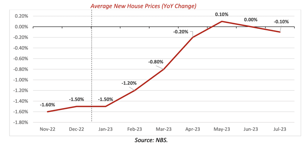 The year-on-year change in the price of new houses plummeted in 2022 due to China’s real estate crisis, bearing in mind that many new houses are pre-sold prior to completion. The decline in new house prices narrowed in the first couple of months of 2023. The rate of increase then slowed sharply in May – leading to fears that pent-up demand was already fading – and prices then fell again in June and July.