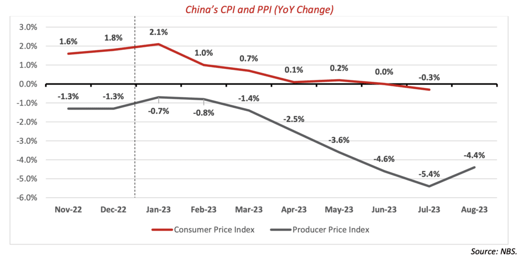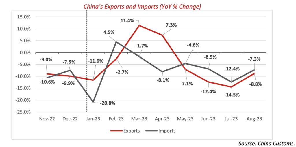 Weak foreign demand – due to inflation – and falling purchases of electronic products are the main reason for the declining exports, which has hampered China’s recovery. This overall decline in exports is not unique to China and has been plaguing other economies as well. Weak external demand has also put downward pressure on China’s imports, since many are materials used to manufacture goods for export. Weak consumer demand and China’s struggling property sector have also played a role. However, both imports and exports showed some signs of stabilisation in August, beating analyst’s expectations.