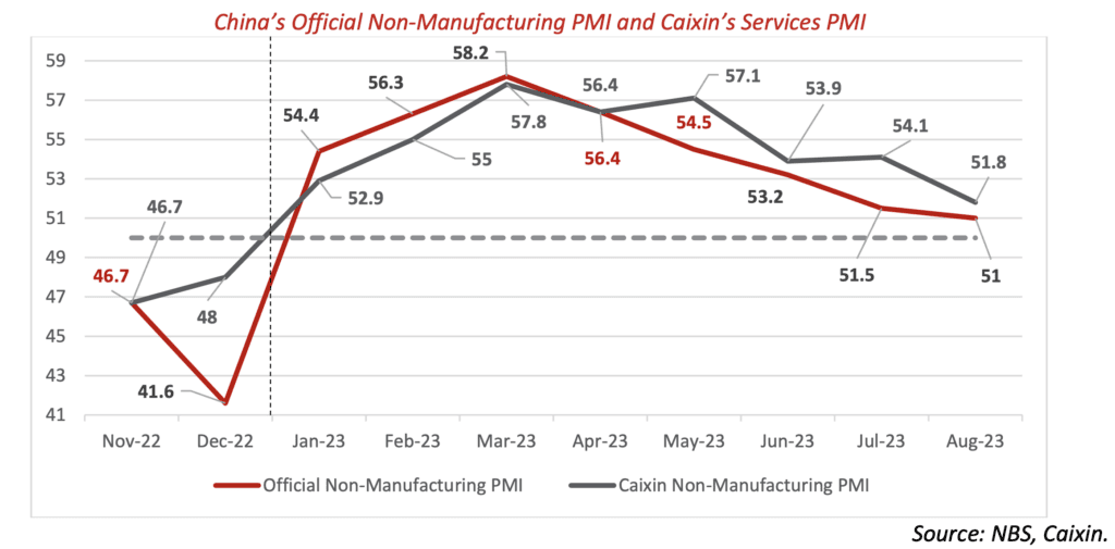Non-manufacturing PMI is an official index that covers services and construction. Its readings and data are similar to manufacturing PMI, with a reading of 50 implying neither growth nor contraction. Caixin’s equivalent is the Service PMI, which does not include construction.