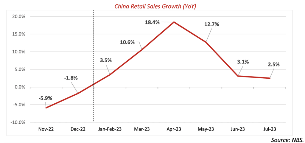 China’s retail sales appear to have been boosted by post-Covid ‘revenge spending’ to some degree – as predicted – but a reduction in retail spending since April points to falling demand as a result of depressed consumer confidence. That being said, a sector-by-sector breakdown shows that sales in many areas were robust in July: