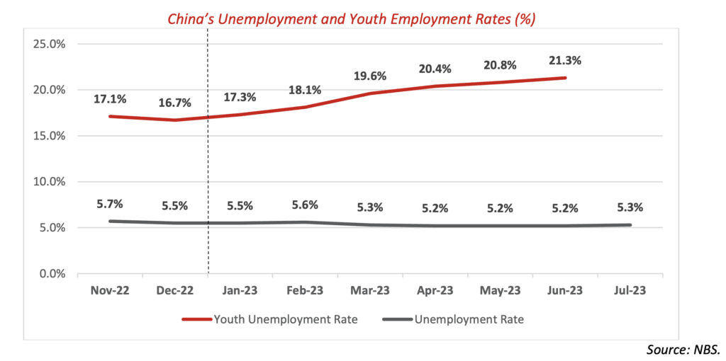 China’s youth unemployment rate rose to a record high of 21.3% in June 2023, breaking the previous record high of 20.8% recorded in May, after which point the government announced it was temporarily suspending the publication of figures.