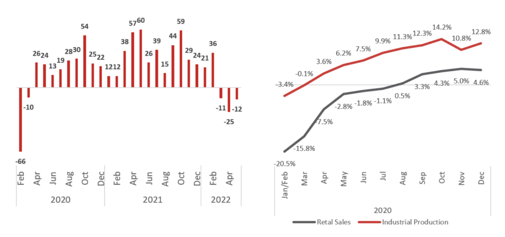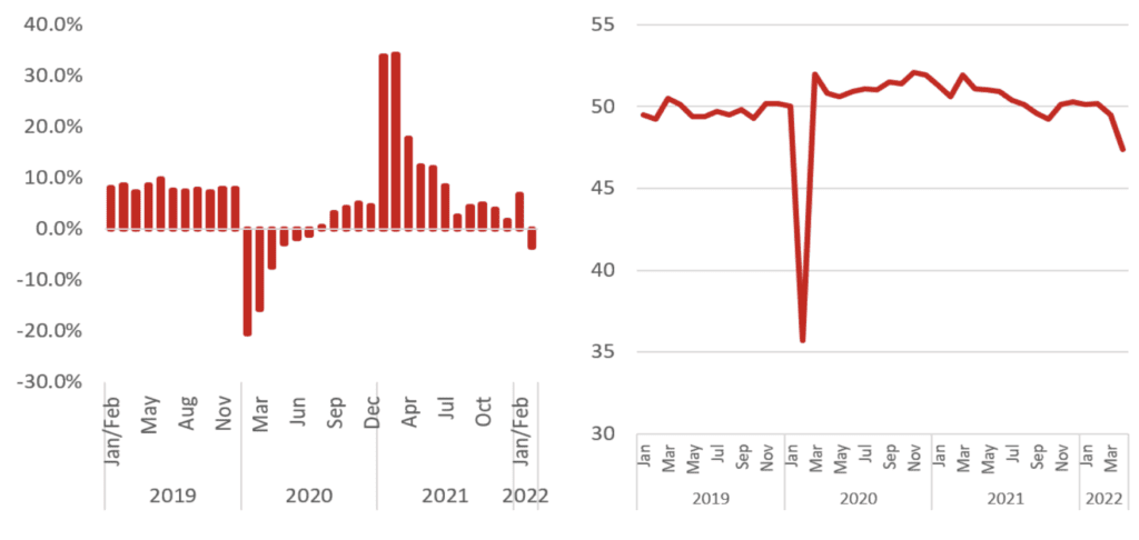 Year-on-year retail sales growth (left) and 2019-2022 official manufacturing PMI (right) (Source: National Bureau of Statistics)