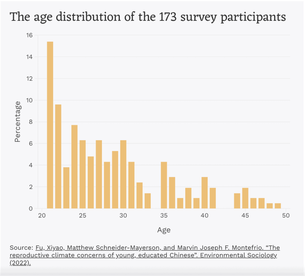 Reproductive climate concerns are also gradually emerging among younger Chinese people. At the end of 2020, Fu Xiyao, Matthew Schneider-Mayerson and Marvin Joseph F. Montefrio used an online questionnaire to survey 173 people in China who were concerned or alarmed about climate change. Most of the respondents were urban residents and women between 21 and 35, the majority of whom had at least a bachelor’s degree, and one-fifth of whom were already parents.