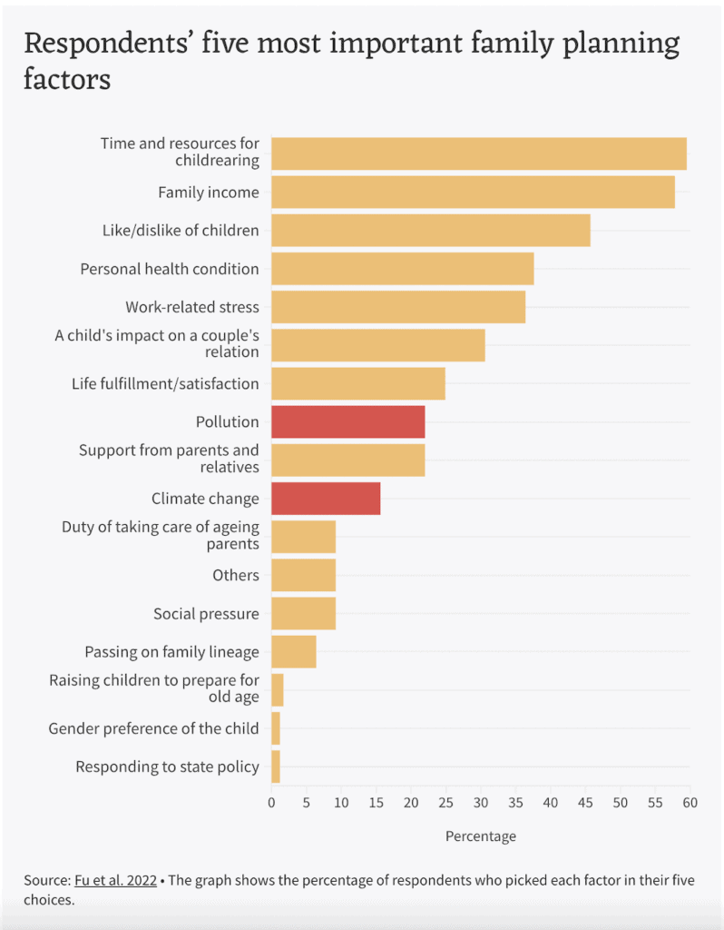 Climate change is not the principal factor influencing young Chinese people’s reproductive choices. Over half the respondents cited childcare time, resources, and family income in determining whether and how many children to have. Only 22% cited environmental pollution, and 15.6% cited climate change.