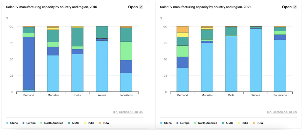 China’s geographical size and characteristics mean it has an abundance of the raw materials essential to PV components. The charts above from the IEA show, for example, how China has increased its production of polysilicon to over three quarters of the global supply. Data from Statista show that 98% of Europe’s rare earth imports (which it does not produce itself) originated from China in 2021.