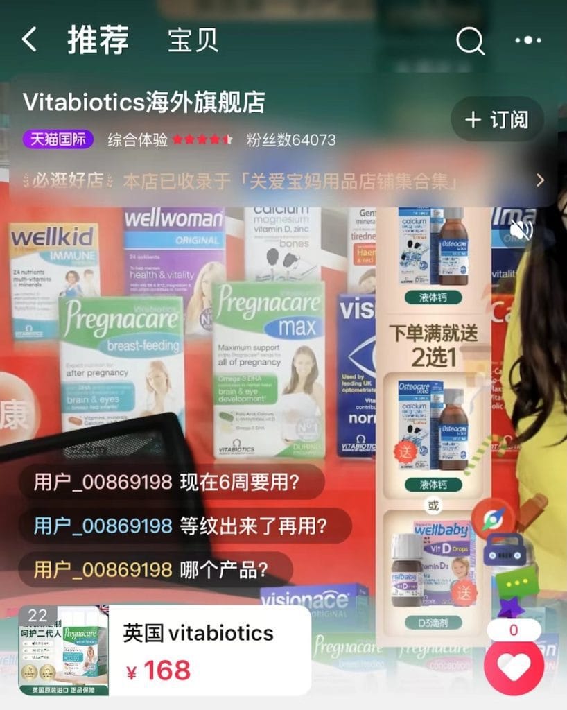 Homepage of the Vitabiotics store on Tmall Global, with an ongoing live stream featuring its Pregnacare range