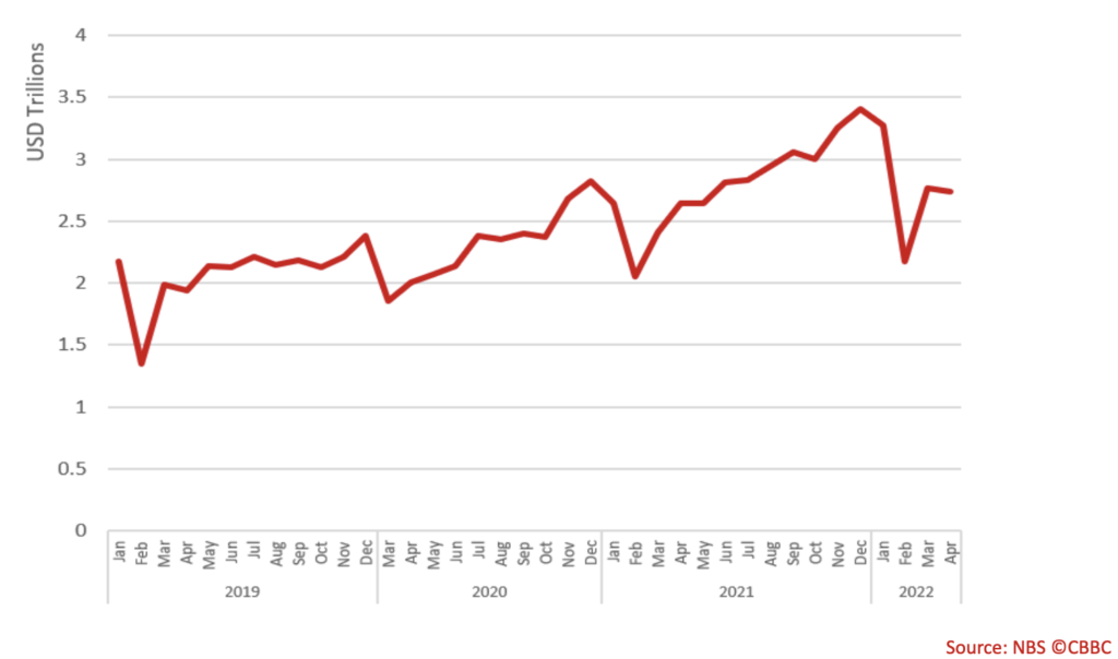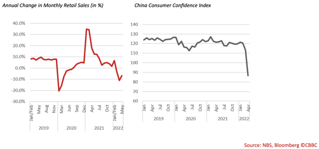 Consumption, too, is sluggish. According to the latest figures published by China’s National Bureau of Statistics, retail sales in the first five months of 2022 decreased 1.5% year-on-year. In May, overall consumption declined by 6.7% year on year, with food services alone down by more than a fifth compared to last year. And while the drop in consumer spending is less severe than at the beginning of the pandemic, the hit to consumer confidence is far more damaging. In April, China’s consumer confidence index fell – for the first time since 2016 – below the 100-mark to 87.6. As a comparison, in 2020 at the height of the first Covid wave, confidence only dropped to 112.6.