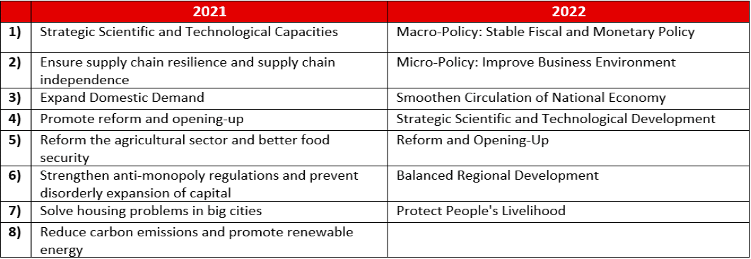 Confronted with these challenges, this year’s CEWC focused on basic economics rather than long-term strategies. For example, last year’s top priority – scientific and strategic development – is now only the fourth most important item on 2022’s priority list. Other long-term issues, like the reform of China’s agricultural sector and the reduction of carbon emissions, are mentioned as secondary goals but are not referred to as primary concerns anymore. Instead, stable macroeconomic policies and supply-side oriented microeconomic reforms are at the top of the government’s agenda.