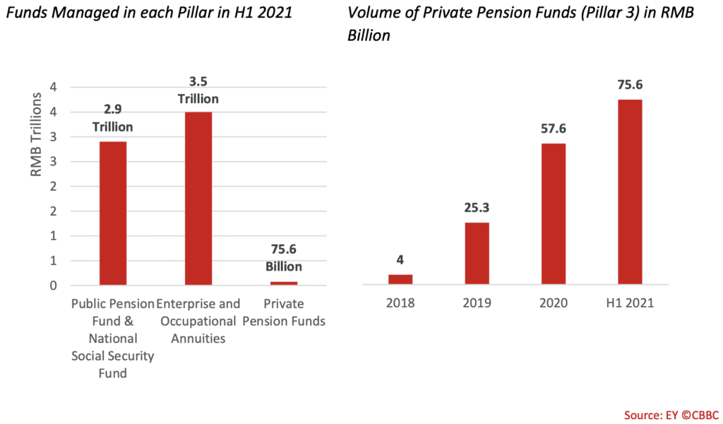 It is, however, private pensions which promise the biggest growth opportunity in the coming years. According to EY data, the total value of private pensions funds in 2018 was just RMB4 billion. Two years later, the value had increased to RMB57.6 billion – a 1,340% growth. Independent consultancies quoted by Reuters estimate that the value of China’s pension funds could rise to at least RMB1.7 trillion by 2025.